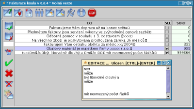 Jakoukoliv fakturu dohledáte během několika sekund pomocí čísla, odběratele, částky, nebo jen pomocí telefonního čísla nebo mailu (odběratele) systém sám prohledává všechny tyto údaje .... Pro extrémě rychlý způsob zadávání položek, a zakládání nových faktur můžete použít klávesnicové kódy, je zabudovaná také podpora scannerů čárových kódů, kdy práce zadávání položek je tak rychlé, jako odbavení u pokladen v supermarketech ... Pro textové faktury je možné mít předdefinované libovolné množství frází, nebo celých odstavců, které lze do tvořených faktur libovolně kombinovat. | |