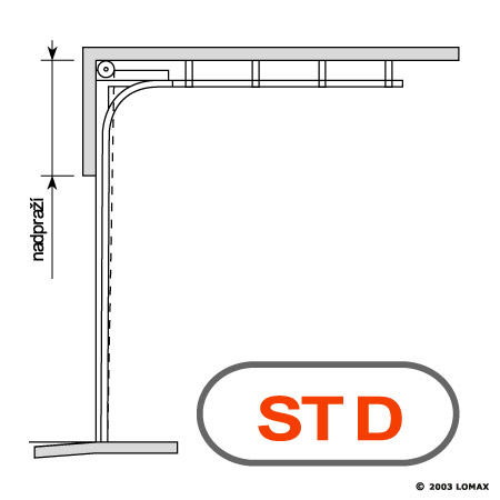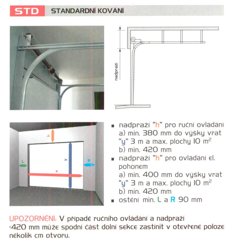 Kolejnicový systém pro standardní nadpraží s pružinami vpředu a lankovými bubny uvnitř kolejnicového systému. Podmínky: a) min. 380 mm do výšky vrat *y* 3 m a max. plochy 10 m² b) min. 420 mm a) min. 400 mm do výšky vrat 3 m a max. plochy 10 m² b) min. 420 mm UPOZORNĚNÍ: V případě ručního ovládání a nadpraží 420 mm může spodní část dolní sekce zastínit v otevřené poloze několik cm otvoru. |