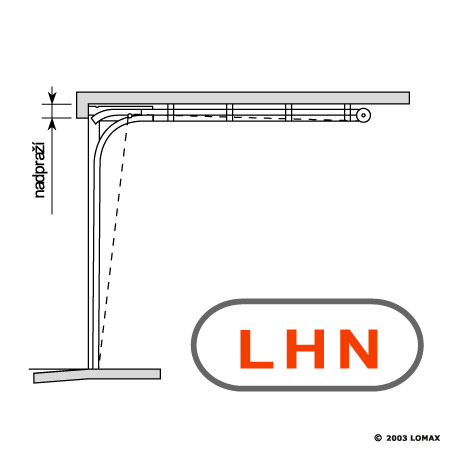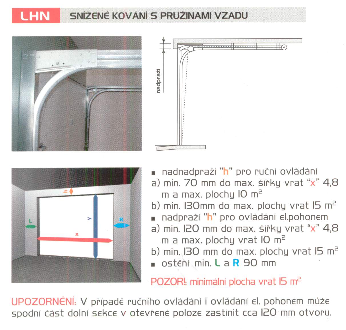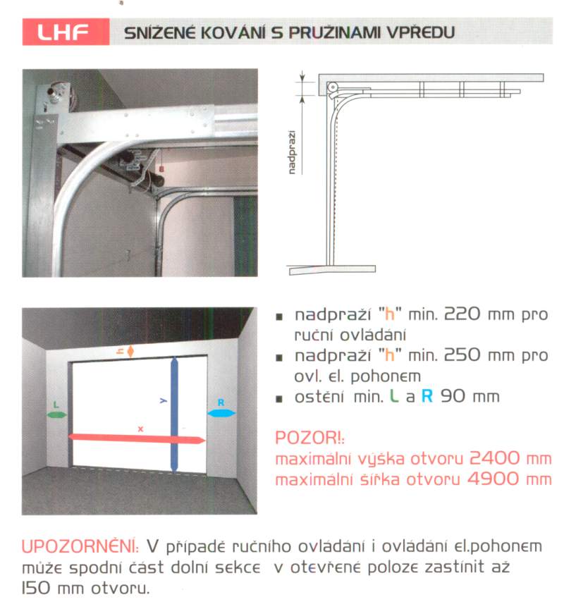LHN - SNÍŽENÉ KOVÁNÍ Podmínky: a) min. 70 mm (klika ve spodní sekci) do maximální šířky vrat "x" 4,8m a max.plochy 10m² b) min.130mm do max.plochy vrat 15m² a) min.120mmdo max. šířky vrat "x" 4,8m a max.plochy vrat 10m² b) min.130mm do max.plochy vrat 15m² POZOR!: Maximální plocha vrat 15 m². UPOZORNĚNÍ: V případě ručního ovládání i ovládání el. pohonem zastíní v otevřené poloze spodní část dolní sekce cca 120 mm otvoru. |